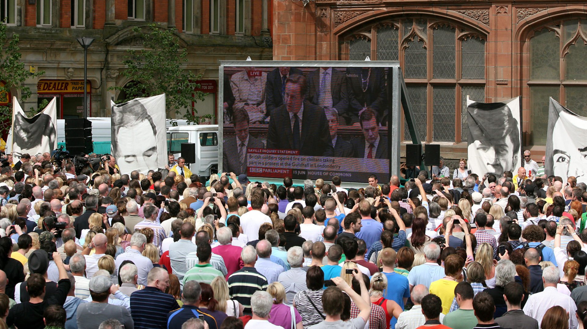 People in Derry watch David Cameron make a statement in the wake of the Saville Inquiry. Picture by: Alamy.com.For the families, the Saville report was a huge relief. The truth was finally on record and their loved ones were declared innocent to the world. But more than a decade and a half has since elapsed and not a single soldier has served a day in prison.